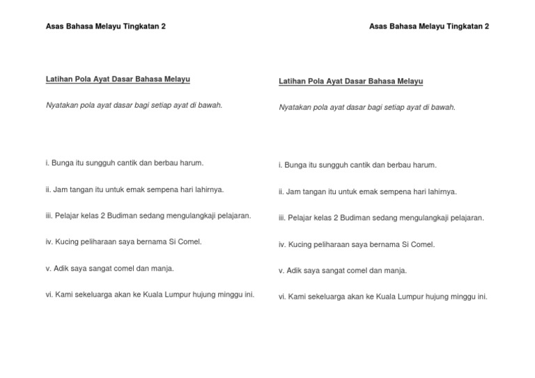 Latihan Pola Ayat Dasar Bahasa Melayu